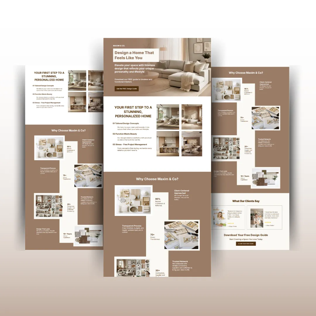 Captures potential design clients by offering a valuable freebie, followed by an automated nurture sequence to warm leads.